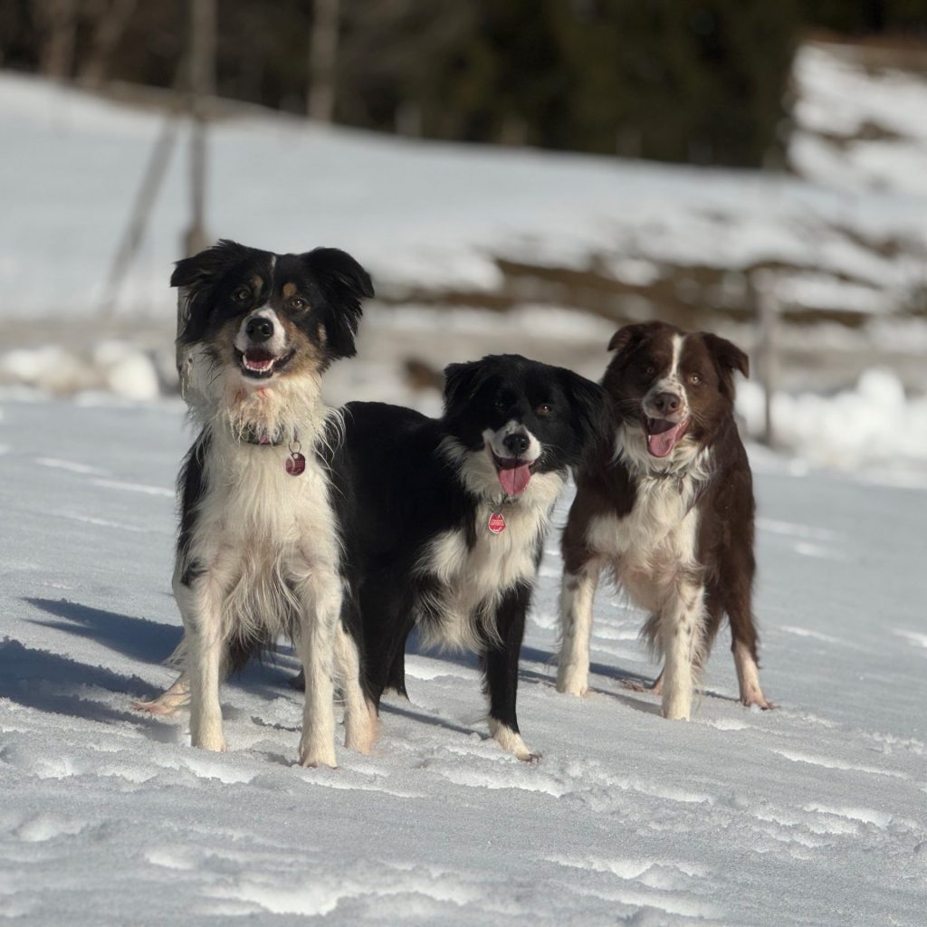 Die drei Border Collies Mona (schwarz-weiß-braun), Abby (schwarz-weiß) und Duplo (braun-weiß) sind die treuen Begleiter von Hofnachfolgerin Linda. Immer in Bewegung, voller Lebensfreude und Tatendrang, bringen sie Schwung in den Alltag. Ob beim Rennen über die Wiesen, beim Spielen oder einfach als verschmuste Gefährten – mit ihrer lebhaften Art sorgen sie stets für gute Laune.